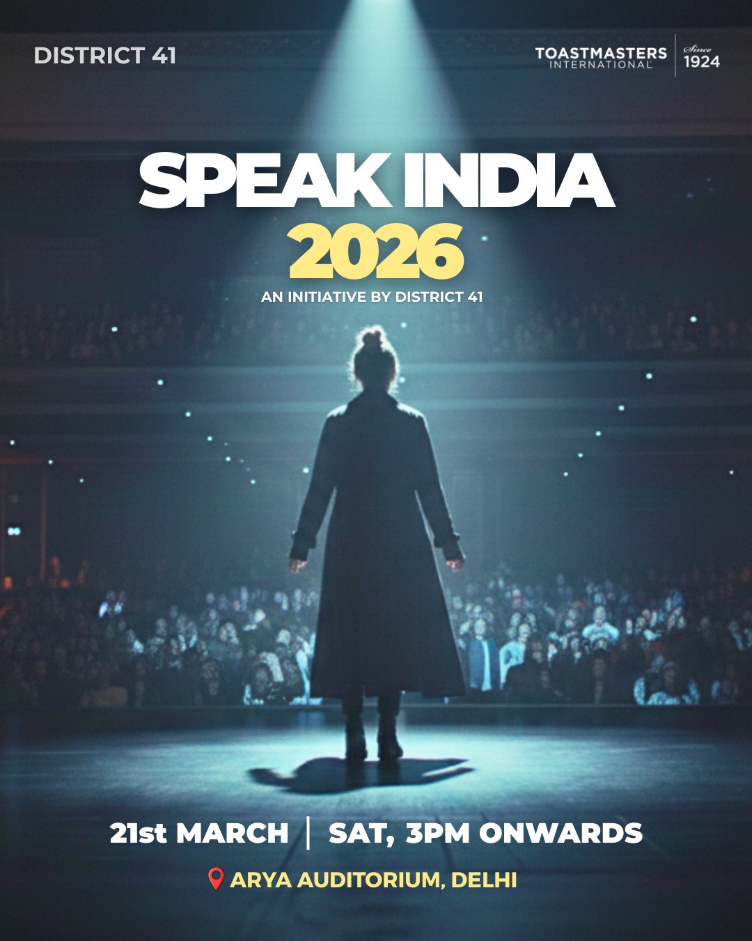 Imagine this: a packed auditorium, the spotlight finds you, a thousand eyes lock in... and for the next few minutes, the only thing that matters is your voice. That's Speak India 2026. The flagship spectacle by District 41, Toastmasters International, where India's boldest speakers, dreamers, and storytellers collide on one electric stage.
